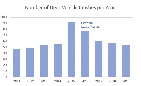 Deer-vehicle collisions (DVCs) have decreased steadily since deer culling has started in Ann Arbor. They have decreased from an high of 90 in 2015 to 50 in 2019 (the last year of data currently available).